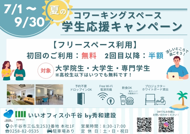 コワーキングスペースでは、"夏の学生応援キャンペーン"を開催中です!